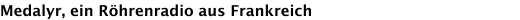 Hier haben wir erst einmal meine Lieblingsradios, leider haben sie kleine Probleme: Hier gefällt mir die Verpackung der Röhren und Elektrik sehr gut. Es sind noch Schnörkel und Elemente, die nur dem Aussehen dienen. Das Röhrenradio, einen Franzosen, stammt wahrscheinlich aus den 50ger Jahren. Der Name der Firma ist MEDALYR. Die Röhrenbestückung (5 Stück), leider nur noch die 6M7MG, 6H8MG und 6AF6 vorhanden, ist von der Firma Mazda. Leider finde ich keinerlei Unterlagen, bis auf ein zweites Modell der Firma aus den 30ger Jahren. Wer weiß mehr?