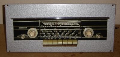 Und dann hätten wir noch ein so genanntes Schulfunkradio der Firma Telefunken. Es stammt aus dem Jahre 1948 und wurde wohl für den Schulfunk auf den Lehrertisch gestellt; diese Radios hatten eins gemeinsam: Bedienung in Richtung Tafel/Lehrer und die Lautsprecher in Richtung Klasse/Schüler. Zu diesem Gerät, genaue Bezeichnung ist Telefunken DN 10002, fehlt mir der Schaltplan.
